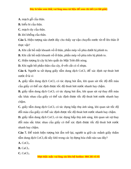 Đây là bản xem th , vu ử i lòng mua tài li u ệ đ xe ể m chi ti t (c ế ó l i ờ gi i ả ) A. m ch g ạ ỗ c a u thân. B. bi u bì ể c a u thân. C. m ch r ạ ây c a u thân. D. khí khổng c a u thân. Câu 5. Hi n ệ tư ng ợ nào dư i ớ đây cho th y â s ự v n ậ chuy n ể nư c ớ t ừ r ễ lên thân ở th c v ự t ậ ? A. Khi c t ắ bỏ m t ô khoanh v ỏ t