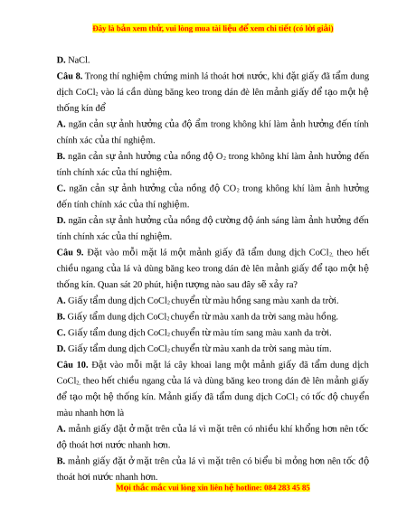 ô đô CO2 trong không khí làm nh a hư ng ở đ n t ê ính chính xác c a u thí nghi m ệ . D. ngăn c n a sự nh a hư ng ở c a u n ng ô đô cư ng ờ đ ô ánh sáng làm nh a hư ng ở đ n ê tính chính xác c a u thí nghi m ệ . Câu 9. Đ t ặ vào m i ỗ m t ặ lá m t ô m nh a gi y â đã t m ẩ dung d ch i CoCl2, theo h t ê chi u ề ngang c a