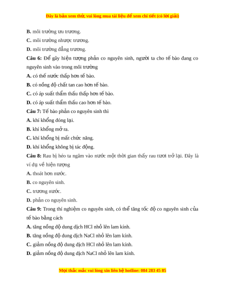 Đây là bản xem th , vu ử i lòng mua tài li u ệ đ xe ể m chi ti t (c ế ó l i ờ gi i ả ) B. môi trư ng ơ u t ư rư ng. ơ C. môi trư ng nh ơ ư c ợ trư ng. ơ D. môi trư ng đ ơ ng ă trư ng. ơ Câu 6: Đ ê gây hi n ệ tư ng ợ ph n ả co nguyên sinh, ngư i ơ ta cho t ê bao đang co