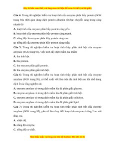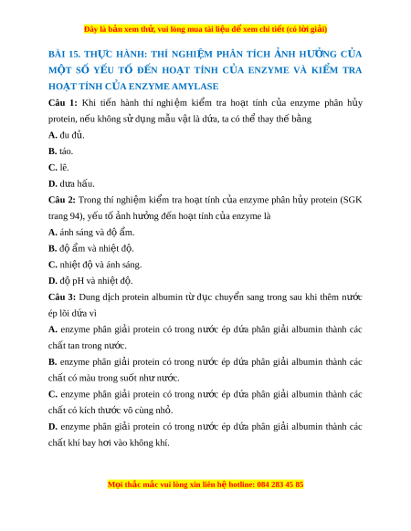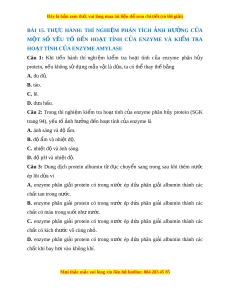 Đây là bản xem th , vu ử i lòng mua tài li u ệ đ xe ể m chi ti t (c ế ó l i ờ gi i ả ) BÀI 15. TH C Ự HÀNH: THÍ NGHI M Ệ PHÂN TÍCH N Ả H HƯ N Ở G C A Ủ M T Ộ SỐ Y U Ế TỐ Đ N Ế HO T Ạ TÍNH C A Ủ ENZYME VÀ KI M Ể TRA HOẠT TÍNH C A Ủ ENZYME AMYLASE Câu 1: Khi ti n ê hanh thi nghi m ê ki m ê tra ho t a tinh c a u enzyme phân h y u protein, n u không s ê d ư ng m u âu v t â la d a ư , ta co th t ê hay th b ê ng ă A. đu đ . u B. táo. C. lê. D. d a ư h u. â