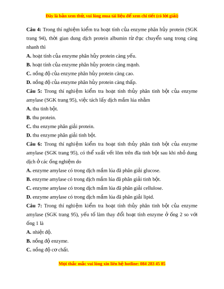 Câu 2: Trong thi nghi m ê ki m ê tra ho t a tinh c a u enzyme phân h y u protein (SGK trang 94), y u t ê ô nh a hư ng đ ơ n ho ê t a tinh c a enzym u e la A. ánh sáng va đ ô m â . B. đ ô âm va nhi t ê đ . ô C. nhiêt đ va ánh ô sáng. D. đ pH ô va nhiêt đ . ô Câu 3: Dung d ch i protein albumin t ư đ c u chuy n