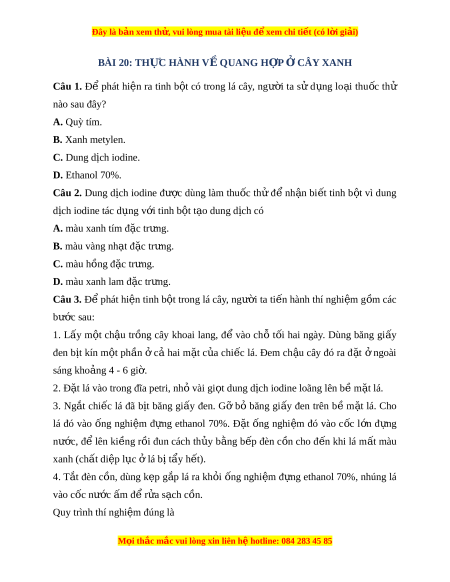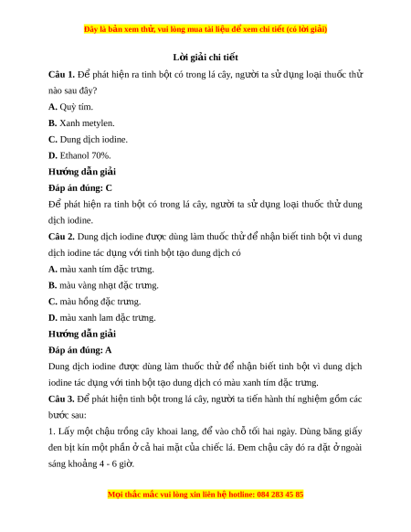 Câu 1. Để phát hi n ệ ra tinh b t ộ có trong lá cây, ngư i ờ ta s ử d ng ụ lo i ạ thu c ố thử nào sau đây? A. Quỳ tím. B. Xanh metylen. C. Dung dịch iodine. D. Ethanol 70%. Câu 2. Dung d ch ị iodine đư c ợ dùng làm thu c ố th ử đ ể nh n ậ bi t ế tinh b t ộ vì dung dịch iodine tác d ng ụ v i ớ tinh b t ộ t o dung d ạ ch có ị A. màu xanh tím đ c ặ tr ng. ư B. màu vàng nh t ạ đặc tr ng. ư C. màu hồng đ c ặ tr ng. ư D. màu xanh lam đ c t ặ r ng. ư