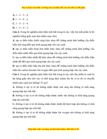 Câu 4. Trong thí nghi m ệ phát hi n ệ tinh b t ộ trong lá cây, vi c ệ b tị m t ộ ph n ầ lá thí nghiệm b ng gi ằ ấy màu đen nh m ằ m c đí ụ ch A. t o ạ ra đi u ề ki n ệ chi u