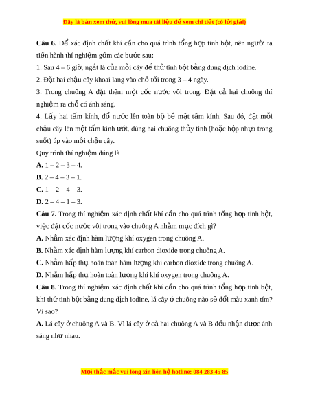 Câu 8. Trong thí nghi m xác đ nh ch t khí c n cho quá trình t ng h p tinh b t,ệ ị ấ ầ ổ ợ ộ