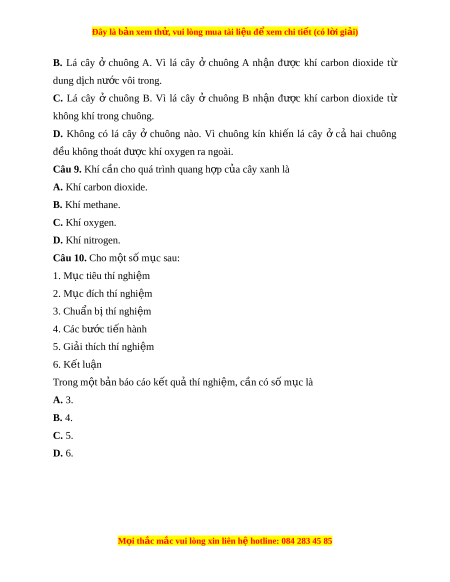 Câu 9. Khí cần cho quá trình quang h p c ợ a ủ cây xanh là A. Khí carbon dioxide. B. Khí methane. C. Khí oxygen. D. Khí nitrogen. Câu 10. Cho m t ộ số m c s ụ au: 1. Mục tiêu thí nghi m ệ 2. Mục đích thí nghi m ệ 3. Chuẩn bị thí nghi m ệ 4. Các bư c ớ ti n ế hành 5. Gi i ả thích thí nghi m ệ 6. K t ế lu n ậ Trong m t ộ b n báo cáo ả k t ế qu t ả hí nghi m ệ , c n có s ầ m ố c l ụ à A. 3. B. 4. C. 5. D. 6. M i