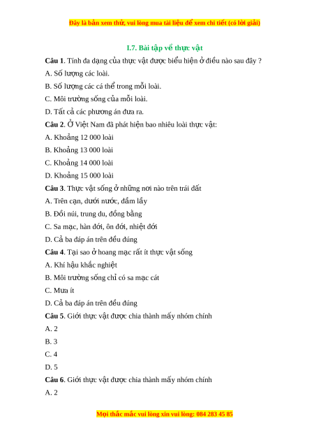 Đây là bản xem th , vu ử i lòng mua tài li u ệ đ xe ể m chi ti t ế (có l i ờ gi i ả ) I.7. Bài tập v t ề hực vật