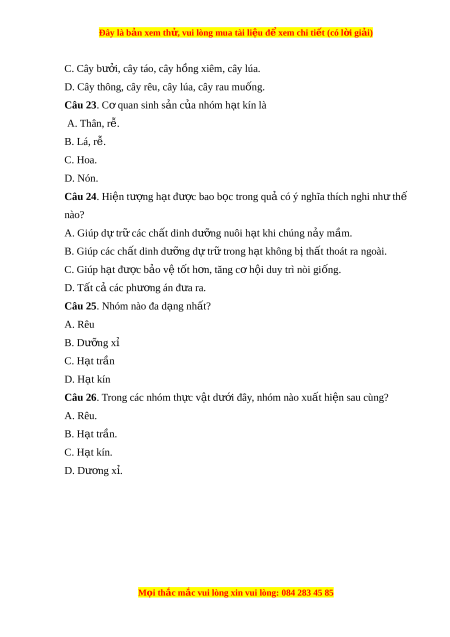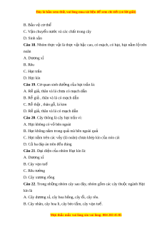 Đây là bản xem th , vu ử i lòng mua tài li u ệ đ xe ể m chi ti t ế (có l i ờ gi i ả ) B. B o v ả ệ c t ơ hể C. V n chuy ậ n ể nư c và các ớ ch t ấ trong cây D. Sinh s n ả Câu 18. Nhóm th c v ự t ậ là th c ự v t ậ b c ậ cao, có m ch, ạ có h t ạ , h t ạ n m ằ l t ộ rên noãn A. Dư ng x ơ ỉ B. Rêu C. H t ạ tr n ầ D. H t ạ kín Câu 19. C quan ơ sinh dư ng c ỡ a ủ h t ạ tr n l ầ à: A. R gi ễ , ả thân và lá ch a ư có m ch d ạ n ẫ B. Rễ gi , t ả hân và lá có m ch d ạ n ẫ C. Rễ th t ậ , thân gỗ, lá kim D. R gi ễ , ả thân và lá có m ch ạ d n ẫ