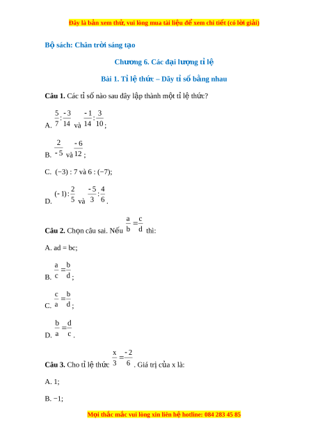 Đây là bản xem th , vu ử i lòng mua tài li u ệ đ xe ể m chi ti t ế (có l i ờ gi i ả ) Bộ sách: Chân tr i ờ sáng t o ạ Chư ng ơ 6. Các đ i ạ lư ng t ợ l ỉ ệ Bài 1. Tỉ l t ệ hức – Dãy t s ỉ ố bằng nhau