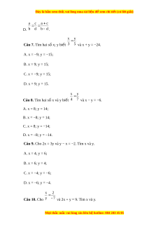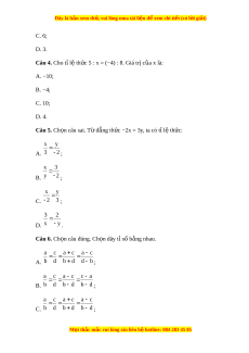 Câu 4. Cho tỉ lệ th c 5 : ứ x = (−4) : 8. Giá tr c ị a ủ x là: A. −10; B. −4; C. 10; D. 4. Câu 5. Ch n câu ọ sai. T đ ừ ng ẳ th c −2x = 3y ứ , ta có t l ỉ t ệ h c: ứ x y A. 3 2 ; x 3 B. y 2 ; x y C. 2 3 ; 3 2 D. x y . Câu 6. Ch n câu ọ đúng. Ch n dãy ọ t s ỉ ố b ng ằ nhau. a c a c a c A. b d b d d b ; a c a c c a B. b d b d b d ; a c a c a c C. b d b d b d ; M i ọ thắc m c