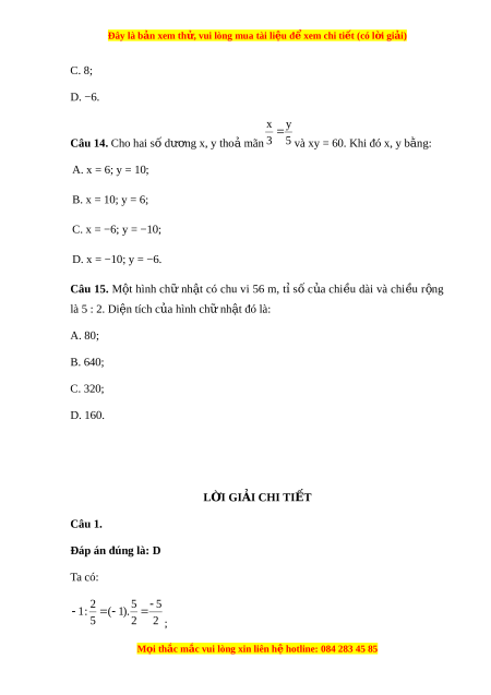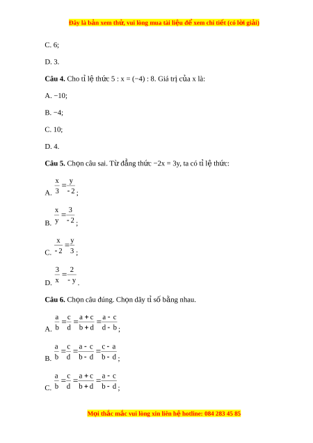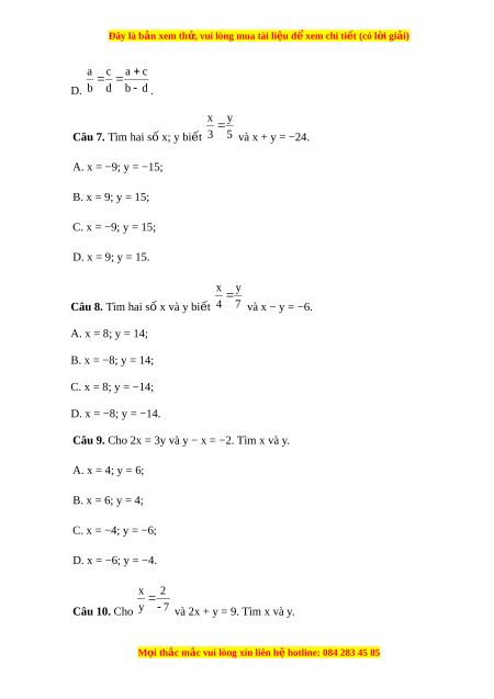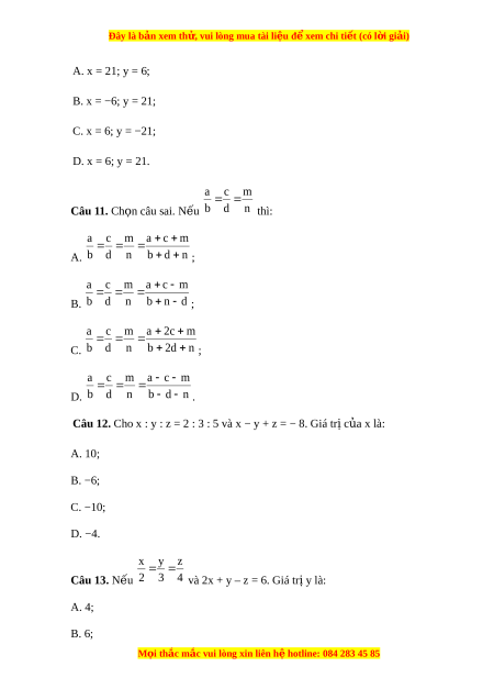 Đây là bản xem th , vu ử i lòng mua tài li u ệ đ xe ể m chi ti t ế (có l i ờ gi i ả ) A. x = 21; y = 6; B. x = −6; y = 21; C. x = 6; y = −21; D. x = 6; y = 21. a c m Câu 11. Ch n câu ọ sai. N u ế b d n thì: a c m a c m A. b d n b d n ; a c m a c m B. b d n b n d ; a c m a 2c m C. b d n b 2d n ; a c m a c m D. b d n b d n .