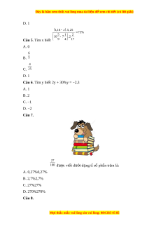 Đây là bản xem th , vu ử i lòng mua tài li u ệ đ xe ể m chi ti t ế (có l i ờ gi i ả ) D. 1 1,16 x .5, 25 75 % 5 1 2 10 7 .2 Câu 5. Tìm x bi t ế 9 4 17 A. 0 6 B. 5 4 C. 25 D. 1 Câu 6. Tìm y bi t ế 2y + 30%y = −2,3 A. 1 B. 2 C. −1 D. −2 Câu 7. 27 100 đư c ợ vi t ế dư i ớ d ng ạ t s ỉ ố ph n t ầ răm là: A. 0,27%0,27% B. 2,7%2,7% C. 27%27% D. 270%270% Câu 8. M i