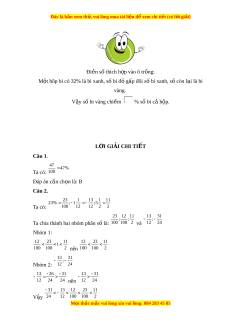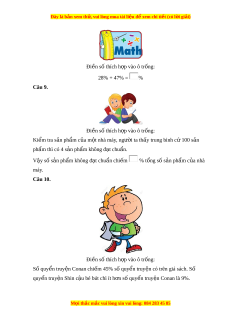 Đây là bản xem th , vu ử i lòng mua tài li u ệ đ xe ể m chi ti t ế (có l i ờ gi i ả ) Đi n s ề ố thích h p vào ô t ợ r ng: ố 28% + 47% = % Câu 9. Đi n s ề ố thích h p vào ô t ợ r ng: ố Ki m ể tra s n ả ph m ẩ c a ủ m t ộ nhà máy, ngư i ờ ta th y t ấ rung bình cứ 100 s n ả ph m ẩ thì có 4 s n ph ả ẩm không đ t ạ chuẩn. V y s ậ ố s n ả ph m ẩ không đ t ạ chu n chi ẩ m ế % tổng số s n ph ả ẩm c a nhà ủ máy. Câu 10. Đi n s ề ố thích h p vào ô t ợ r ng: ố Số quy n t ể ruy n C ệ onan chi m ế 45% số quy n ể truy n có t ệ rên giá sách. S ố quy n t ể ruyện Shin c u ậ bé bút chì ít h n s ơ quy ố n t ể ruy n C ệ onan là 9%. M i