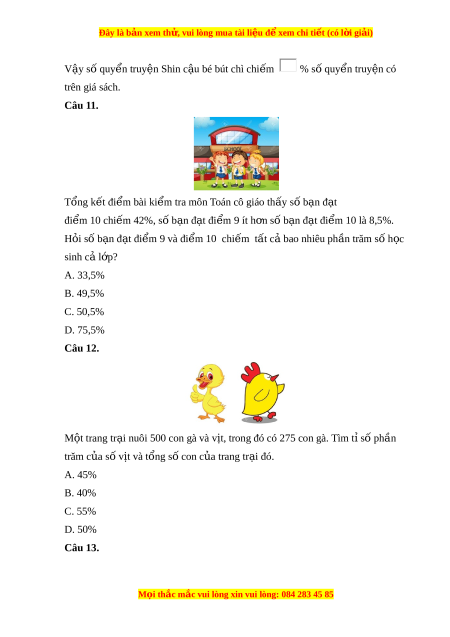 ạ nuôi 500 con gà và vịt, trong đó có 275 con gà. Tìm tỉ số phần trăm c a ủ s v ố t ị và t ng s ổ ố con c a t ủ rang tr i ạ đó. A. 45% B. 40% C. 55% D. 50% Câu 13. M i