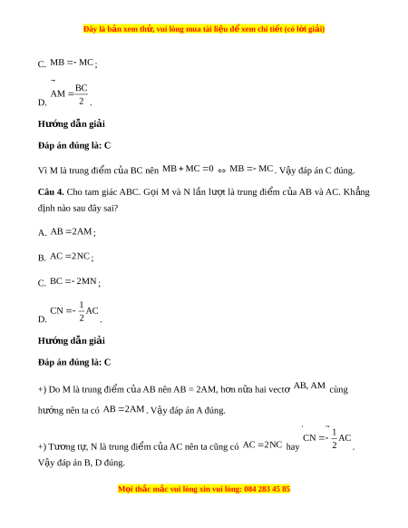 BC AM D. 2 . Hư ng d ớ ẫn gi i ả Đáp án đúng là: C Vì M là trung đi m ể c a ủ BC nên MB MC 0