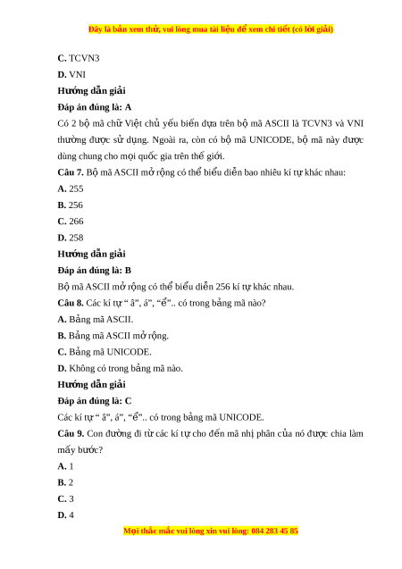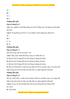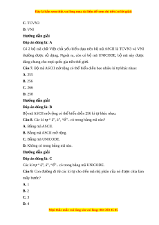 Ngoai ra, còn co bộ ma UNICODE, bộ ma nay đư c ợ dùng chung cho m i ọ quôc gia trên th gi ế i ơ . Câu 7. B m ộ a ASCII m r ở ng co t ộ h b ể i u ể di n bao nhi ê êu kí t khác nhau: ự A. 255 B. 256 C. 266 D. 258 Hư ng ớ d n gi ẫ i ả