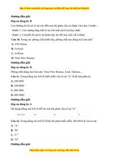 a Unicode: Time New Roman, Arial, Tahoma… Câu 11. Trong b ng a ma ASCII bi u di ể n c ê a kí ủ t “A ự ” h ở nh ê phân l i a: A. 100 0001 B. 100 0000 C. 000 0001 D. 000 0000 Hư ng d ớ ẫn gi i ả