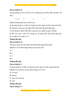 Đáp án đúng là: A S d ử ng b ụ ng a ma ASCII đ t ể ìm ma nh phân c i a kí ủ t “A ự ” Câu 12. Trong b ng a ma ASCII h ở nh ê phân bi i u di ể n ê 100 0010 la c a kí ủ t : ự A. “A” B. “B” C. “C” D. ”D” Hư ng d ớ ẫn gi i ả M i ọ thắc m c