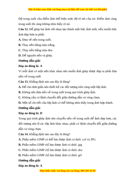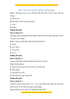 B. Rectangle Select ho c E ă llip Select. C. Crop D. Eraser Hư ng ơ d n gi ẫ i ả Đap an đúng là: D S ư d ng u công c u Eraser đ ê t y â m t ô s ô ch ô trên nh a s e phat hi n ê nh a co n n ê trong suôt hay không. Câu 2. Công c ph u ô bi n nh ê ât dung đ t ê ach nh a la: A. Eraser B. Free Select C. Move Tool D. Crop Hư ng ơ d n gi ẫ i ả Đap an đúng là: B Công c ph u ô bi n nh ê ât dung đ t ê ach nh a la Free Select Câu 3. Kênh alpha la: A. Kênh l u đ ư t ô rong suôt c a t u t â c cac đi a m ê nh. a B. nh ngu A ôn. C. L p ơ nh c a ân x l ư i. D. nh không co n A n t ê rong suôt. Hư ng ơ d n gi ẫ i ả Đap an đúng là: A GIMP l u ư tr