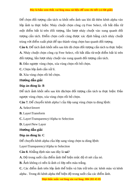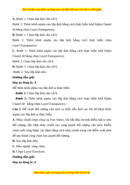 ơ 2: Thêm kênh anpha vao l p ơ nh a b ng ă cach th c ư hi n ê Add Alpha Chanel t b ư ng a ch n L o ayer\Transparency. Câu 5. Đ ê ch n o đ i ô tư ng ơ c n â tach ra kh i o n n ê nh a sau khi đa thêm kênh anpha vao l p ơ nh t a a th c ư hi n ê : A. Nhay chu t ô ch n o công c u Free Select, r i ô b t ă đ u â t ư m t ô đi m ê b t â ki trên đôi tư ng, ơ l n â lư t ơ nhay chu t ô vao xung quanh đ i ô tư ng ơ c n â tach. Đi m ê ch n o cuôi cung đư c ơ xac đ nh i b ng ă cach nhay chu t ô trung v i ơ đi m ê xu t â phat đ t ê o a thanh vung ch n bao o quanh đ i ô tư ng. ơ B. Xoa l p ơ nh a n n. ê C. Đ o a ngư c vung ch ơ n. o D. Ch n o Layer\Transform Hư ng d ơ ẫn gi i ả Đap an đúng là: A M i o thắc m c