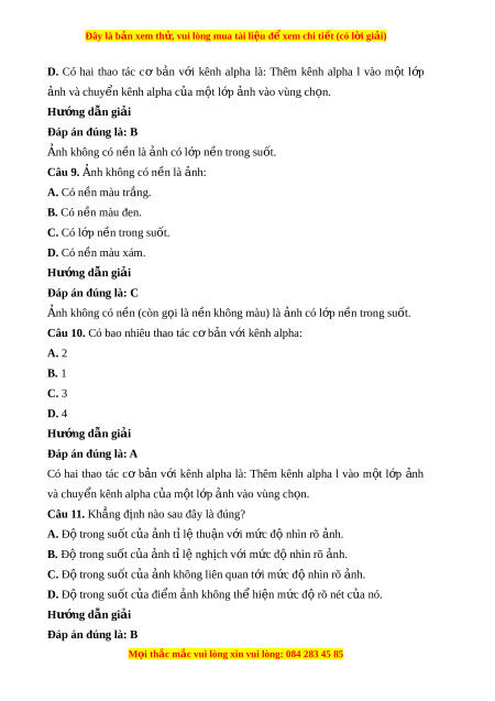 ơ kênh alpha la: Thêm kênh alpha l vao m t ô l p ơ nh a va chuy n ê kênh alpha c a u m t ô l p ơ nh vao a vung ch n. o Câu 11. Kh ng ă đ nh nao s i au đây la đung? A. Đ t ô rong suôt c a u nh t a l i t ê hu n v â i ơ m c đ ư nhi ô n ro nh. a B. Đ t ô rong suôt c a u nh a t l i ngh ê ch v i i ơ m c đ ư nhi ô n ro nh. a C. Đ t ô rong suôt c a u nh không l a iên quan t i ơ m c ư đ nhi ô n ro nh. a D. Đ t ô rong suôt c a u đi m ê nh không t a h hi ê n m ê c đ ư r ô o net c a u no. Hư ng d ơ ẫn gi i ả Đap an đúng là: B M i o thắc m c