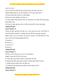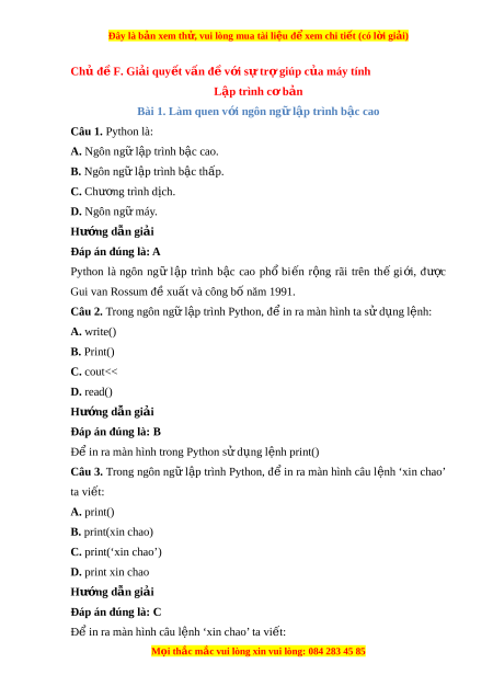 Đây là bản xem th , vu ử i lòng mua tài li u ệ đ xe ể m chi ti t ế (có l i ờ gi i ả ) Chủ đ F ề . Giải quy t ế v n đ â v ề i ơ s t ư r gi ơ up c a m ủ ay tinh Lâp trinh c b ơ n ả Bài 1. Làm quen v i ơ ngôn ng l ư p t â rinh b c â cao Câu 1. Python là: A. Ngôn ng l ư p t â rinh b c â cao. B. Ngôn ng l ư p t â rinh b c t â h p. â C. Chư ng ơ trinh dich. D. Ngôn ng m ư ay. Hư ng ơ d n gi ẫ i ả Đap an đung là: A Python là ngôn ng ư l p â trinh b c â cao ph ô bi n ê r ng ô rai trên th ê gi i ơ , đư c ơ Gui van Rossum đ xu ê t â và công b năm ô 1991.