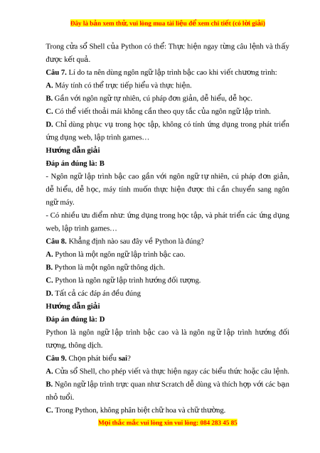 Câu 7. Li do ta nên dung ngôn ng l ư p t â rinh b c cao khi â vi t ê chư ng ơ trinh: A. May tinh co th t ê r c t ư i p hi ê u và t ê h c hi ư n. ê B. Gân v i ơ ngôn ng t ư nh ư iên, cu phap đ n gi ơ n, a d hi ê u, d ê h ê c. o C. Co th vi ê t ê tho i a mai không c n t â heo quy t c c ă a u ngôn ng l ư p t â rinh. D. Ch i dung ph c u v u trong h c o t p, â không co tinh ng ư d ng u trong phat tri n ê ng d ư ng w u eb, l p â trinh games… Hư ng ơ d n gi ẫ i ả Đap an đung là: B - Ngôn ng ư l p â trinh b c â cao gân v i ơ ngôn ng ư t ư nhiên, cu phap đ n ơ gi n, a d ê hi u, ê d ê h c, o may tinh mu n ô th c ư hi n ê đư c ơ thi c n â chuy n ê sang ngôn ng m ư ay. - Co nhi u ê u ư đi m ê nh : ư ng ư d ng u trong h c o t p, â và phat tri n ê cac ng ư d ng u web, l p t â rinh games… Câu 8. Kh ng đ ă inh nào sau đây v Pyt ê hon là đung? A. Python là m t ô ngôn ng l ư p t â rinh b c cao. â B. Python là m t ô ngôn ng t ư hông d ch. i
