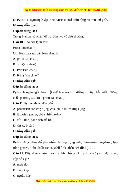 ư p’ trong câu lênh print(‘xin chao’) Câu 11. Python đư c ơ dung đê: A. phat tri n cac ê ng ư d ng w u eb, ph n m â m ê ng d ư ng u B. l p t â rinh games, đi u khi ê n ê robot C. x l ư i nh, a phân tich d l ư i u, … ê D. C a A, B và C. Hư ng d ơ ẫn gi i ả Đap an đung là: D Python đư c ơ dung đê phat tri n ê cac ng ư d ng u web, ph n â m m ê ng ư d ng, u l p â trinh games, đi u ê khi n ê robot, x l ư i nh, a phân tich d l ư i u, … ê
