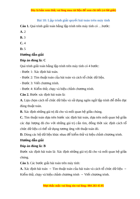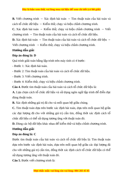 Đây là bản xem th , vu ử i lòng mua tài li u ệ đ xe ể m chi ti t (c ế ó l i ờ gi i ả ) B. Vi t ê chư ng ơ trình → Xác đ nh i bai toán → Tìm thu t ậ toán c a u bai toán va cách tô ch c ư d l ư i u ê → Ki m ê th , ch ư y a va hi u ch ê nh ch i ư ng t ơ rình. C. Xác đ nh i bai toán → Ki m ê th , ư ch y a va hi u ê ch nh i chư ng ơ trình → Vi t ê chư ng ơ trình → Tìm thu t ậ toán c a bai u toán va cách tô ch c d ư l ư i u ê . D. Xác đ nh i bai toán → Tìm thu t ậ toán c a u bai toán va cách t ch ô c ư d ư li u ê → Vi t ê chư ng ơ trình → Ki m ê th , ch ư y a va hi u ch ê nh ch i ư ng t ơ rình. Hư ng d ớ ẫn gi i ả Đáp án đúng là: D Quá trình gi i ả toán b ng ằ l p t