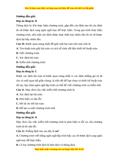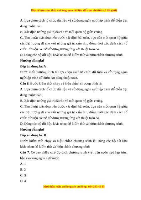 Đây là bản xem th , vu ử i lòng mua tài li u ệ đ xe ể m chi ti t ế (có l i ờ gi i ả ) A. L a ự ch n ọ cách tô ch c ư d ư li u ê va s ư d ng ụ ngôn ng ư l p ậ trình đ ê đi n ễ đ t a đúng thu t ậ toán. B. Xác đ nh nh i ng ư giá tr đã cho va m i i ố quan h gi ê a chúng. ư C. Tìm thu t ậ toán d a ự trên bư c ớ xác đ nh i bai toán, d a ự trên m i ố quan h ê gi a ư các đ i a lư ng ơ đã cho v i ớ nh ng ư giá tr ic n â tìm, đ ng ô th i ơ xác đ nh i cách tô ch c d ư l ư iêu có th s ê d ư ng t ụ ư ng ơ ng v ư i ớ thu t ậ toán đó. D. Dung các b d ô l ư iêu khác nhau đ ki ê m ê th va hi ư u ch ê nh ch i ư ng ơ trình. Hư ng ớ d n gi ẫ i ả Đáp án đúng là: A Bư c ớ vi t ê chư ng ơ trình la:L a ự ch n ọ cách tô ch c ư dư li u ê va sư d ng ụ ngôn ng l ư p t ậ rình đ đi ê n đ ễ t a đúng thu t ậ toán. Câu 6. Bư c ớ ki m ê th , ch ư y a va hi u ch ê nh ch i ư ng ơ trình la: A. L a ự ch n ọ cách tô ch c ư d ư li u ê va s ư d ng ụ ngôn ng ư l p ậ trình đ ê đi n ễ đ t a đúng thu t ậ toán. B. Xác đ nh nh i ng ư giá tr đã cho va m i i ố quan h gi ê a chúng. ư C. Tìm thu t ậ toán d a ự trên bư c ớ xác đ nh i bai toán, d a ự trên m i ố quan h ê gi a ư các đ i a lư ng ơ đã cho v i ớ nh ng ư giá tr ic n â tìm, đ ng ô th i ơ xác đ nh i cách tô ch c d ư l ư iêu có th s ê d ư ng t ụ ư ng ơ ng v ư i ớ thu t ậ toán đó. D. Dung các b d ô l ư iêu khác nhau đ ki ê m ê th va hi ư u ch ê nh ch i ư ng ơ trình. Hư ng ớ d n gi ẫ i ả Đáp án đúng là: D Bư c ớ ki m ê th , ư ch y a va hi u ê ch nh i chư ng ơ trình la: Dung các b ô d ư li u ê khác nhau đ ki ê m ê th va hi ư êu chinh chư ng ơ trình.