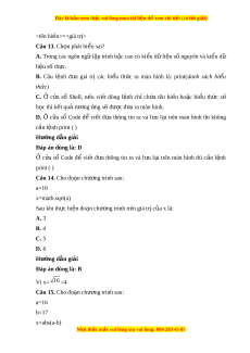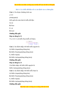 Đây là bản xem th , vu ử i lòng mua tài li u ệ đ xe ể m chi ti t ế (có l i ờ gi i ả ) Bài 4: Cac ki u d ể l ư i u s ệ và câu l ô nh vào- ệ ra đ n gi ơ n ả Câu 1. Cho đo n a chư ng t ơ rinh sau: a=3.4 print(type(a)) K t ê qu t a rên man hinh la ki u d ê l ư i u: ê A. int B. float C. str D. bool Hư ng ớ d n gi ẫ i ả Đap an đúng là: B Vi a=3.4 ⇒ a la ki u ê float (ki u s ê ố th c) ự . Câu 2. Câu lênh nh p â v i ơ bi n ki ê u nguyên l ê a: A. Bi n=( ê input(dong thông bao) B. Bi n=f ê loat(input(dong thông bao)) C. Bi n=i ê nput() D. Bi n=i ê nt(input(dong thông bao)) Hư ng ớ d n gi ẫ i ả Đap an đúng là: D Câu lênh nh p â v i ơ bi n ki ê u nguyên l ê a: Bi n=i ê nt(input(dong thông bao)) Câu 3. Câu lênh nh p â v i ơ bi n ki ê u t ê h c l ự a: A. Bi n=( ê input(dong thông bao) B. Bi n=f ê loat(input(dong thông bao)) C. Bi n=i ê nput() D. Bi n=i ê nt(input(dong thông bao)) Hư ng ớ d n gi ẫ i ả M i