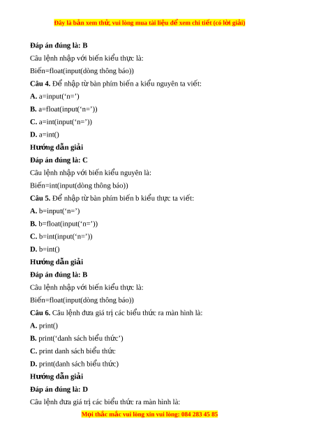 Đây là bản xem th , vu ử i lòng mua tài li u ệ đ xe ể m chi ti t (c ế ó l i ờ gi i ả ) Đap an đúng là: B Câu l nh nh ê p v â i ơ bi n ki ê u t ê h c ự la: Bi n=f ê loat(input(dong thông bao)) Câu 4. Đ nh ê p t â ban phi ư m bi n a ki ê u nguyên ê ta vi t ê : A. a=input(‘n=’)