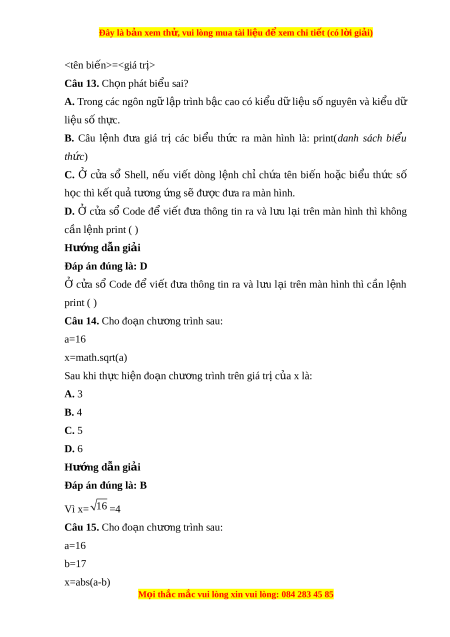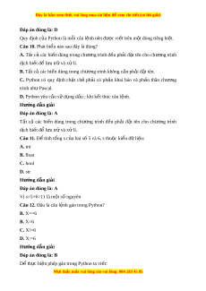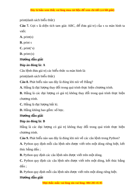 Đây là bản xem th , vu ử i lòng mua tài li u ệ đ xe ể m chi ti t ế (có l i ờ gi i ả ) print(danh sach bi u t ê h c) ư Câu 7. G i o s la di n ê tich tam giac ABC, đ ê đ a ư gia tr ic a u s ra man hinh ta vi t ê : A. print(s) B. print s C. print(‘s) D. print:(s) Hư ng ớ d n gi ẫ i ả Đap an đúng là: A Câu lênh đ a gi ư a tri cac bi u t ê h c ư ra man hinh la: print(danh sach bi u t ê h c) ư Câu 8. Phat bi u nao s ê au đây la đung khi noi v H ê ng? ă A. H ng l ă a đ i a lư ng t ơ