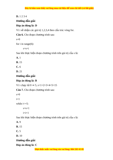 Đáp án đúng là: B Vi i ch y t ạ 0 ư ⇒ 5, s=1+2+3+4+5=15 Câu 7. Cho đo n ạ chư ng t ơ rinh sau: s=0 i=1 while i<=5: s=s+1 i=i+1 Sau khi th c hi ư n đo ê n ch ạ ư ng ơ trinh trên gia tr c i a u s la: A. 9 B. 15 C. 5 D. 10 Hư ng ớ d n gi ẫ i ả