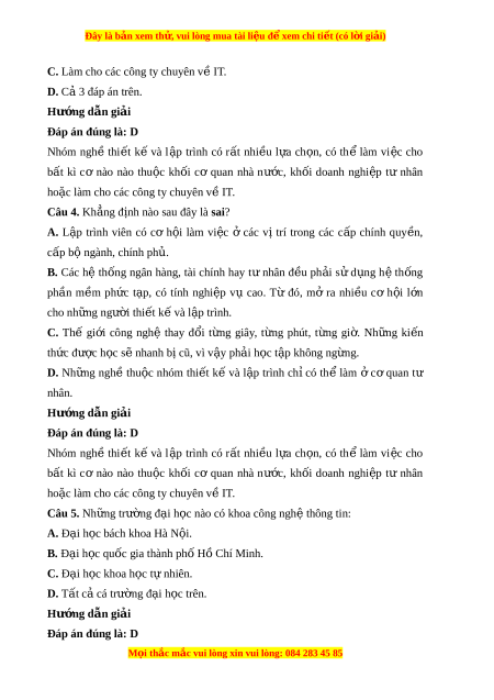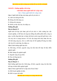 Đây là bản xem th , vu ử i lòng mua tài li u ệ đ xe ể m chi ti t ế (có l i ờ gi i ả ) Hâu h t ê cac trư ng ơ đ i a h c o đ u ê co khoa công ngh ê thông tin, nh t â la cac trư ng ơ đ i a h c o l n. ơ Câu 6. Ngư i ơ theo nghanh thi t ê k va l ê p t â rinh co nh ng đ ữ c ă đi m ê : A. Kiên tri, đam mê. B. T duy l ư ogic va chinh xac. C. Kh năng a t h ự c, s o ang t o, kh a năng đ a c hi o u t ê i ng anh. ê D. Tât c nh a ng đ ữ c đi ă m ê trên. Hư ng ơ d n gi ẫ i ả
