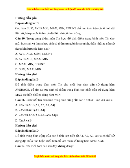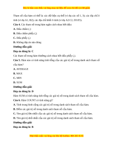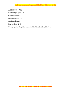 ỉ tính toán trên các ô tính dữ li u s ệ ố, b qua ỏ các ô tính có d l ữ i u ch ệ , ô t ữ ính tr ng. ố Câu 10. Trong b ng ả đi m ể môn Tin h c, ọ để tính đi m ể trung bình môn Tin cho mỗi h c ọ sinh và tìm ra h c ọ sinh có đi m ể trung bình cao nh t ấ , th p ấ nh t ấ ta c n ầ sử d ng l ụ ần lư t ợ các hàm nào? A. AVERAGE, SUM, COUNT B. AVERAGE, MAX, MIN C. MAX, MIN, COUNT D. SUM, MAX, MIN Hư ng d ớ ẫn gi i ả Đáp án đúng là: B Để tính đi m