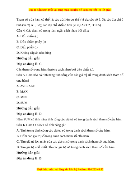 Câu 4. Các tham số trong hàm ngăn cách nhau b i ở d u ấ : A. Dấu chấm (.) B. Dấu ch m ấ phẩy (;) C. Dấu phẩy (,)