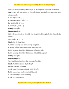 Hàm COUNT có tính năng đ m ế các giá tr s ị t ố rong danh sách tham s c ố a ủ hàm. Câu 7. Cách vi t ế hàm tìm giá tr ịl n ớ nh t ấ c a ủ các giá tr ịs ố trong danh sách tham số c a ủ hàm là: A. =SUM(s 1, s ố ố 2, …) B. =AVERAGE(s 1, s ố 2, …) ố
