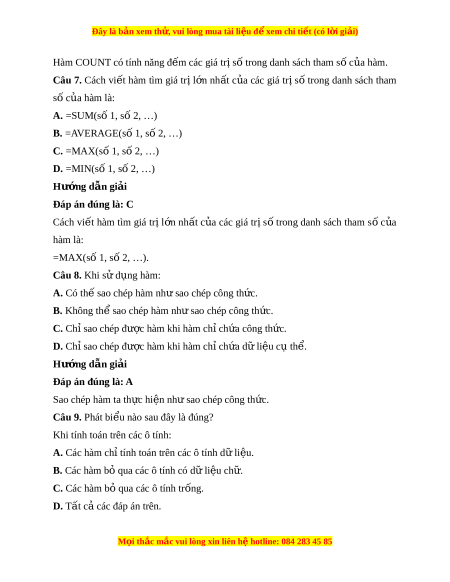 Câu 8. Khi sử d ng hàm ụ : A. Có th s ế ao chép hàm nh s ư ao chép công th c. ứ B. Không th s ể ao chép hàm nh s ư ao chép công th c. ứ