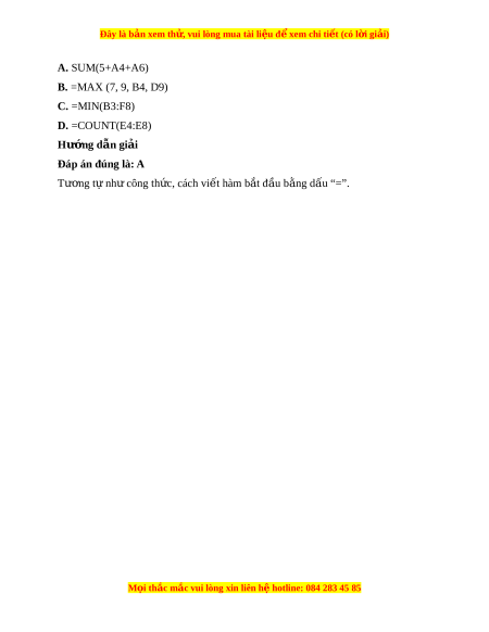 Câu 5. Hàm nào có tính năng tính t ng ổ c a ủ các giá tr ịs ố trong danh sách tham số c a ủ hàm? A. AVERAGE B. MAX C. MIN D. SUM Hư ng d ớ ẫn gi i ả Đáp án đúng là: D