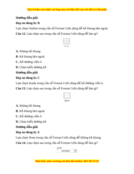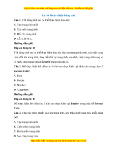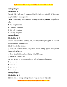 Câu 5. Cho các thao tác sau: a) Trong c a ử sổ Format Cells, ch n ọ trang Broder. Thi p ế l p ậ các thông số kẻ đư ng ờ vi n, k ề khung. ẻ b) Ch n ọ vùng d l ữ i u m ệ u n k ố đ ẻ ư ng vi ờ n, k ề khung. ẻ c) Mở c a s ử ổ Format Cells. Hãy s p ắ x p t ế h t ứ các t ự hao tác đ t ể h c hi ự n k ệ khung, đ ẻ ư ng vi ờ n? ề A. a → b → c B. a → c → b C. b → a → c D. b → c→ a Hư ng d ớ ẫn gi i ả Đáp án đúng là: D Để th c ự hi n k ệ khung, đ ẻ ư ng ờ vi n cho vùng d ề l ữ i u em ệ th c hi ự n: ệ M i