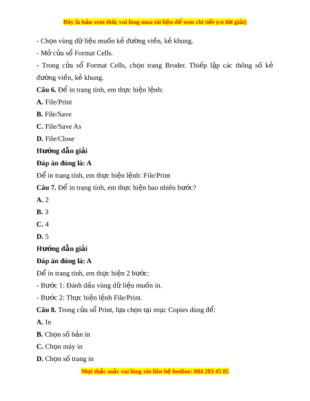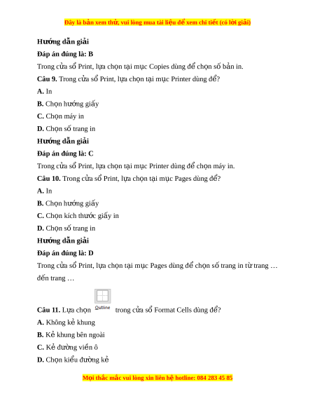 Đây là bản xem th , vu ử i lòng mua tài li u ệ đ xe ể m chi ti t (c ế ó l i ờ gi i ả ) Hư ng d ớ ẫn gi i ả Đáp án đúng là: B Trong c a ử sổ Print, l a ự ch n t ọ i ạ m c ụ Copies dùng đ ch ể n s ọ b ố n ả in. Câu 9. Trong c a ử sổ Print, l a ự ch n t ọ i ạ m c ụ Printer dùng đ ? ể A. In B. Ch n h ọ ư ng ớ gi y ấ C. Ch n ọ máy in D. Ch n ọ số trang in Hư ng d ớ ẫn gi i ả Đáp án đúng là: C Trong c a ử sổ Print, l a ự ch n t ọ i ạ m c ụ Printer dùng đ ch ể n m ọ áy in. Câu 10. Trong c a ử sổ Print, l a ự ch n t ọ i ạ m c ụ Pages dùng đ ? ể A. In B. Ch n h ọ ư ng ớ gi y ấ C. Ch n ọ kích thư c ớ gi y i ấ n D. Ch n ọ số trang in Hư ng d ớ ẫn gi i ả Đáp án đúng là: D Trong c a ử sổ Print, l a ự ch n ọ t i ạ m c ụ Pages dùng đ ể ch n ọ s ố trang in t ừ trang … đ n t ế rang … Câu 11. L a ch ự n ọ trong c a