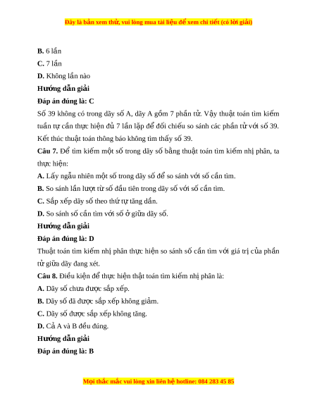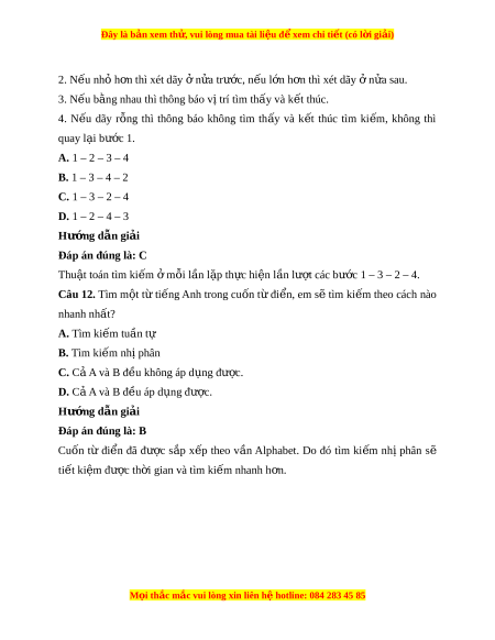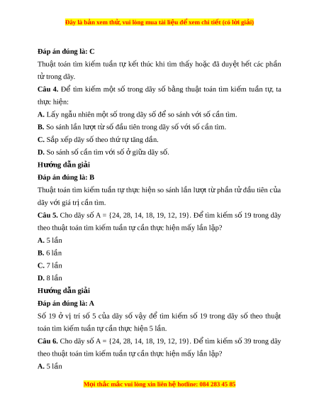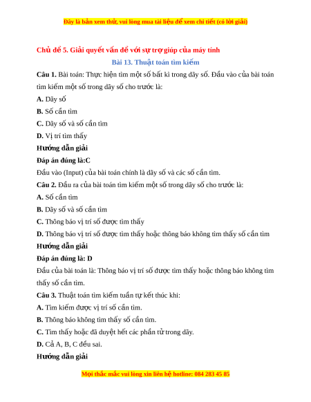 Đây là bản xem th , vu ử i lòng mua tài li u ệ đ xe ể m chi ti t (c ế ó l i ờ gi i ả ) Đáp án đúng là: C Thu t ậ toán tìm ki m ế tu n ầ tự k t ế thúc khi tìm th y ấ ho c ặ đã duy t ệ h t ế các ph n ầ t t ử rong dãy. Câu 4. Để tìm ki m ế m t ộ số trong dãy số b ng ằ thu t ậ toán tìm ki m ế tu n ầ t , ự ta th c ự hi n: ệ