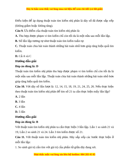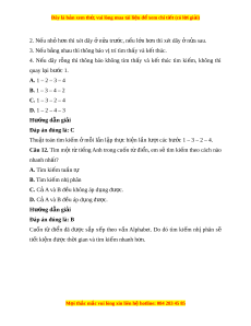 ế nhị phân là dãy số đã đư c ợ s p ắ x p ế (không gi m ả ho c ặ không tăng). Câu 9. u đi Ư m ể c a ủ thu t ậ toán tìm ki m ế nh phân l ị à: A. Thu hẹp đư c ợ ph m ạ vi tìm ki m ế ch còn t ỉ i ố đa là m t ộ n a s ử au m i ỗ l n l ầ p. ặ B. Số lần l p t ặ ư ng ơ t nh ự t ư hu t ậ toán tìm ki m ế tu n t ầ . ự C. Thu t