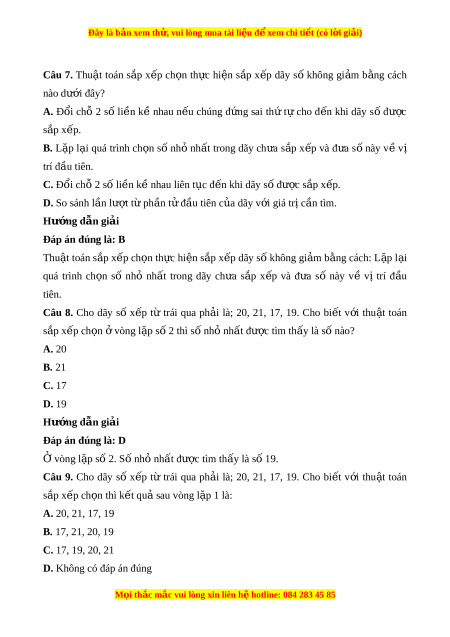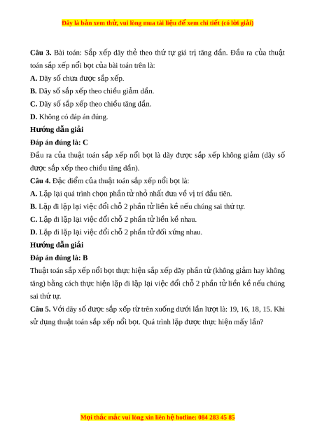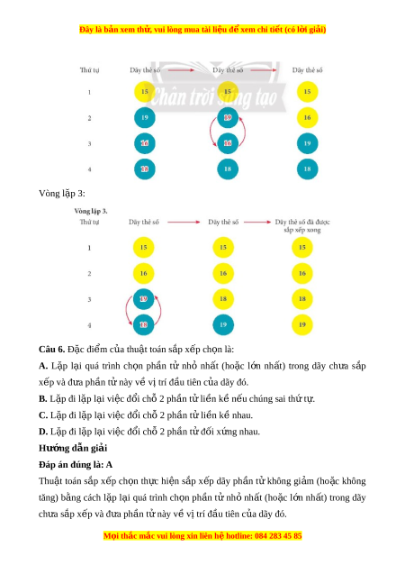 Đây là bản xem th , vu ử i lòng mua tài li u ệ đ xe ể m chi ti t ế (có l i ờ gi i ả ) Vòng l p ặ 3: Câu 6. Đặc đi m ể c a ủ thu t ậ toán s p ắ x p ch ế n ọ là: A. L p ặ l i ạ quá trình ch n ọ ph n ầ tử nhỏ nh t ấ (ho c ặ l n ớ nh t ấ ) trong dãy ch a ư s p ắ x p và ế đ a ph ư n t ầ này v ử v ề t ị rí đ u t ầ iên c a ủ dãy đó. B. L p đi ặ l p l ặ i ạ vi c đ ệ i ổ ch 2 ph ỗ n t ầ l ử i n ề k n ề u chúng s ế ai th t ứ . ự C. L p đi ặ l p ặ l i ạ vi c đ ệ i ổ ch 2 ph ỗ n t ầ l ử i n k ề nhau. ề D. L p đi ặ l p ặ l i ạ vi c đ ệ i ổ ch 2 ph ỗ n t ầ đ ử i ố x ng nhau. ứ Hư ng d ớ ẫn gi i ả Đáp án đúng là: A Thu t ậ toán s p ắ x p ế ch n ọ th c ự hi n ệ s p ắ x p ế dãy ph n ầ t ử không gi m ả (ho c ặ không tăng) b ng ằ cách l p ặ l i ạ quá trình ch n ọ ph n ầ t ử nh ỏ nh t ấ (ho c ặ l n ớ nh t ấ ) trong dãy ch a ư s p ắ x p và đ ế a ph ư n t ầ này v ử ề v t ị rí đ u t ầ iên c a dãy đó. ủ M i ọ thắc m c