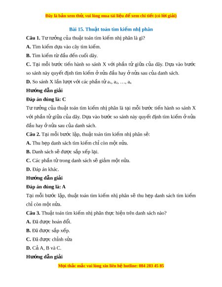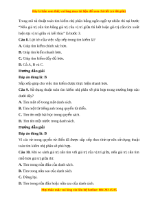 ằ ngôn ngữ tự nhiên thì t i ạ bư c ớ “N u ế giá trị c n ầ tìm b ng ằ giá trị c a ủ v ịtrí gi a ữ thì k t ế lu n ậ giá tr ịc n ầ tìm xu t ấ hiện t i ạ vị trí gi a ữ và k t ế thúc” là bư c ớ 3. Câu 8. L i ợ ích c a ủ vi c s ệ p x ắ p ế trong tìm ki m ế là? A. Giúp tìm ki m ế chính xác h n. ơ B. Giúp tìm ki m ế nhanh h n. ơ C. Giúp tìm ki m ế đ y đ ầ h ủ n. ơ D. C ả A, B và C. Hư ng d ớ ẫn gi i ả Đáp án đúng là: B S p ắ x p gi ế úp cho vi c t ệ ìm ki m ế đư c t ợ h c hi ự n nhanh h ệ n. ơ Câu 9. Sử d ng ụ thu t ậ toán tìm ki m ế nhị phân sẽ phù h p ợ trong trư ng ờ h p ợ nào dư i ớ đây? A. Tìm m t ộ số trong m t ộ danh sách. B. Tìm m t ộ t t ừ i ng anh t ế rong quy n ể t đi ừ n. ể C. Tìm tên m t ộ bài h c ọ trong quy n s ể ách. D. Tìm tên m t ộ nư c t ớ rong danh sách. Hư ng d ớ ẫn gi i ả Đáp án đúng là: B Vì các từ trong quy n ể từ đi n ể đã đư c ợ s p ắ x p