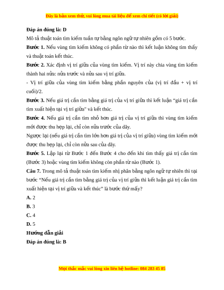 Đây là bản xem th , vu ử i lòng mua tài li u ệ đ xe ể m chi ti t (c ế ó l i ờ gi i ả ) Đáp án đúng là: D Mô t t ả hu t ậ toán tìm ki m ế tu n t ầ b ự ng ằ ngôn ng t ữ nhi ự ên g m ồ có 5 bư c. ớ Bước 1. N u ế vùng tìm ki m ế không có ph n ầ từ nào thì k t ế lu n ậ không tìm th y ấ và thu t ậ toán k t ế thúc. Bước 2. Xác đ nh ị vị trí gi a ữ c a ủ vùng tìm ki m
