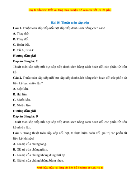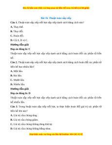 Đây là bản xem th , vu ử i lòng mua tài li u ệ đ xe ể m chi ti t ế (có l i ờ gi i ả ) Bài 16. Thu t ậ toán s p x ắ p ế Câu 1. Thu t ậ toán s p ắ x p n ế i ổ b t ọ s p ắ x p danh ế sách b ng ằ cách nào? A. Thay th . ế B. Thay đổi. C. Hoán đổi. D. Cả A, B và C. Hư ng d ớ ẫn gi i ả Đáp án đúng là: C Thu t ậ toán s p ắ x p ế n i ổ b t ọ s p ắ x p ế danh sách b ng ằ cách hoán đ i ổ các ph n ầ tử li n ề k . ề Câu 2. Thu t ậ toán s p ắ x p n ế i ổ b t ọ s p ắ x p danh s ế ách b ng cách ằ hoán đ i ổ các ph n t ầ ử li n k ề bao ề nhiêu l n? ầ A. M t ộ lần. B. Hai lần. C. Mư i ờ lần. D. Nhi u l ề ần. Hư ng d ớ ẫn gi i ả Đáp án đúng là: D Thu t ậ toán s p ắ x p ế n i ổ b t ọ s p ắ x p ế danh sách b ng ằ cách hoán đ i ổ các ph n ầ tử li n ề k nhi ề u ề lần. Câu 3. Trong thu t ậ toán s p ắ x p ế n i ổ b t ọ , ta th c ự hi n ệ hoán đ i ổ giá trị các ph n ầ tử li n k ề khi ề nào? A. Giá tr c ị a chúng t ủ ăng. B. Giá tr c ị a ủ chúng gi m ả . C. Giá tr c ị a chúng không đúng t ủ h t ứ . ự D. Giá tr c ị a chúng không b ủ ng ằ nhau. M i