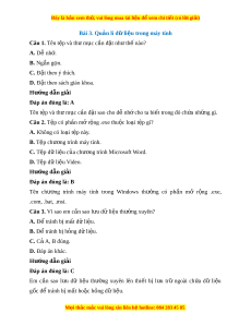 Đây là bản xem th , vu ử i lòng mua tài li u ệ đ xe ể m chi ti t (c ế ó l i ờ gi i ả ) Bài 3. Quản lí d l ữ i u t ệ rong máy tính Câu 1. Tên t p và t ệ h m ư c c ụ n đ ầ t ặ nh t ư h nào? ế A. Dễ nh . ớ B. Ng n g ắ n. ọ C. Đ t ặ theo ý thích. D. Đ t ặ theo sách giáo khoa. Hư ng d ớ ẫn gi i ả Đáp án đúng là: A Tên t p và t ệ h m ư c c ụ n đ ầ t ặ sao cho dễ nh cho t ớ a bi t ế trong đó ch a nh ứ ng gì ữ .