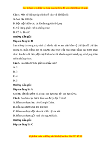 ư thông tin trong máy tính có nhi u ề r i ủ ro, em c n ầ b o ả v ệ d ữ li u ệ đ ể d ữ li u ệ không bị m t ấ , h ng ỏ hay bị ngư i ờ khác truy c p ậ trái phép b ng ằ các bi n ệ pháp nh : ư Sao l u ư dữ li u, ệ đ t ặ m t ậ kh u ẩ cho tài kho n ả ngư i ờ s d ử ng, ụ s d ử ng ụ ph n ầ m m ề chống virus. Câu 5. Sao l u d ư ữ li u g ệ m ồ có m y l ấ o i ạ ? A. 2 B. 3 C. 4 D. 5 Hư ng d ớ ẫn gi i ả Đáp án đúng là: A Sao l u d ư ữ li u g ệ m ồ có 2 lo i ạ : sao l u c ư c b ụ , ộ sao l u t ư xa. ừ Câu 6. Sao l u c ư c ụ b l ộ à b n ả sao đư c ợ đ t ặ đâu? ở A. B n s ả ao đư c l ợ u ư trên Google Drive. B. B n ả sao đư c ợ đ a l ư ên Internet. C. B n s ả ao đư c đ ợ t ặ trên các thi t ế b l ị u t ư r . ữ D. B n s ả ao đư c g ợ i ử mail cho ngư i ờ khác. Hư ng d ớ ẫn gi i ả Đáp án đúng là: C M i
