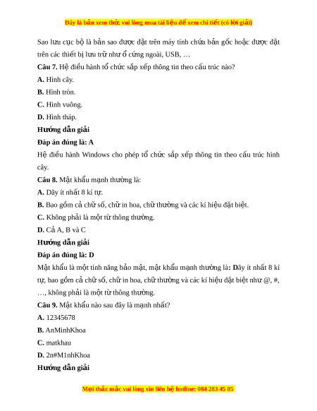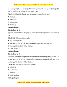 ề hành Windows cho phép tổ ch c ứ s p ắ x p ế thông tin theo c u ấ trúc hình cây. Câu 8. M t ậ khẩu m nh t ạ hư ng ờ là: A. Dãy ít nh t ấ 8 kí t . ự B. Bao gồm cả ch s ữ ố, ch i ữ n hoa, ch t ữ hư ng và các ờ kí hi u đ ệ t ặ bi t ệ . C. Không ph i ả là m t ộ t t ừ hông thư ng. ờ D. C ả A, B và C Hư ng d ớ ẫn gi i ả Đáp án đúng là: D M t ậ kh u ẩ là m t ộ tính năng b o ả m t ậ , m t ậ kh u ẩ m nh ạ thư ng ờ là: Dãy ít nh t ấ 8 kí tự, bao gồm c ả ch ữ s , ch ố ữ in hoa, ch ữ thư ng ờ và các kí hi u đ ệ t ặ bi t ệ nh ư @, #, …, không ph i ả là m t ộ t t ừ hông thư ng. ờ Câu 9. M t